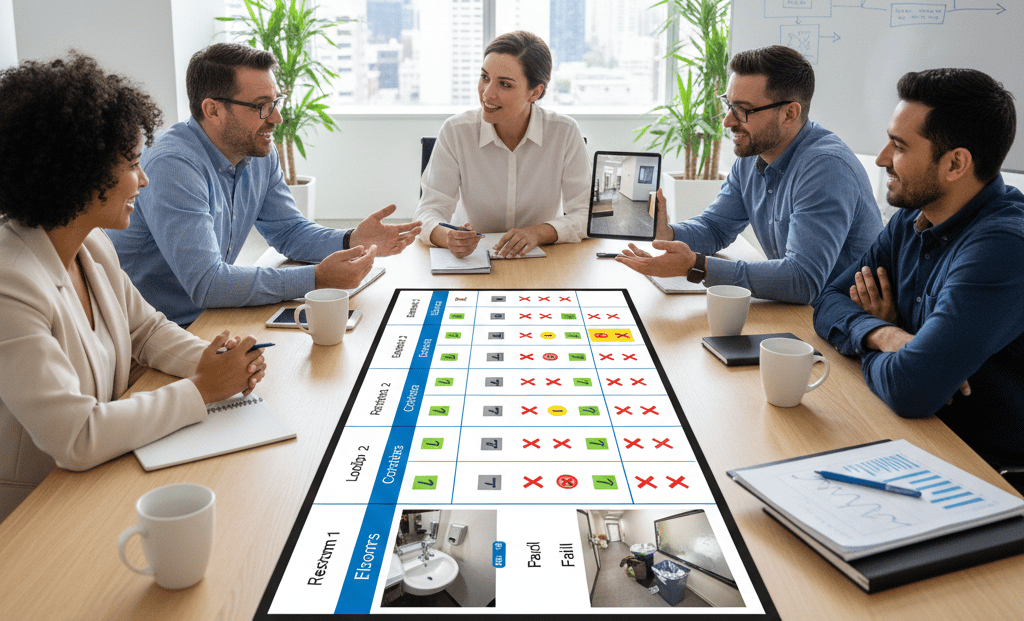 Implement monthly scorecards: Once a month, have PM or building staff walk each floor with the scorecard, capture quick photos of hotspots, and log scores in a shared tracker by area and vendor.
